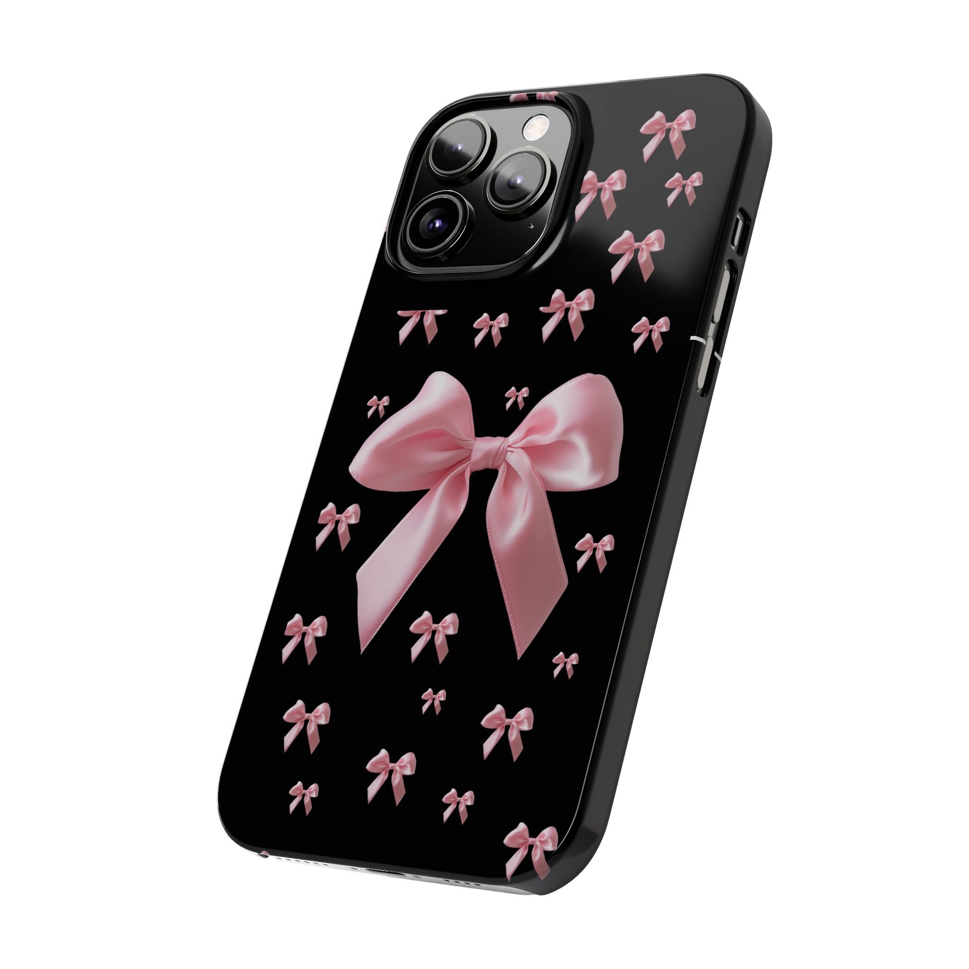 Introducing our stylish Slim Phone Case designed with pink bows on a classic black backdrop.