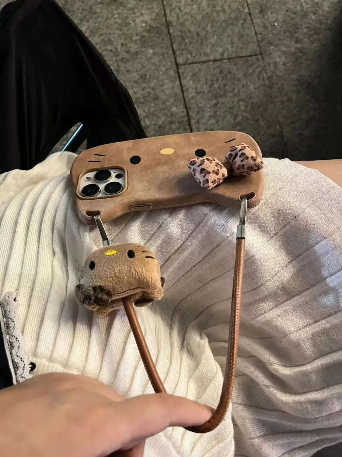 Sanrio Hello Kitty Lovable Brown Leopard Print Bow Phone Case For iPhone 16 15 14 13 Pro Max Y2K Girl Cute Hand Strap Back Cover